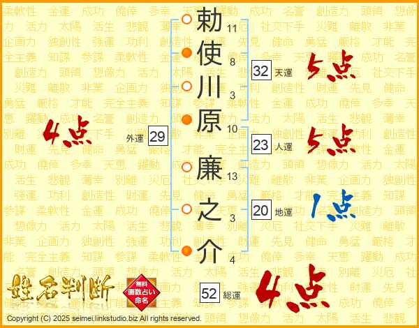 勅(11画)使(8画)川(3画)原(10画) 廉(13画)之(3画)介(4画)