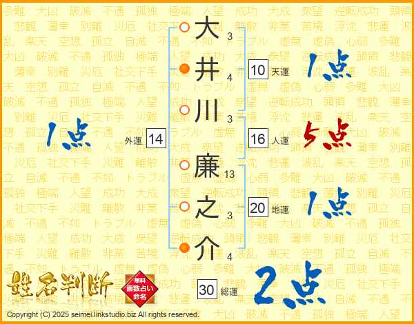 大(3画)井(4画)川(3画) 廉(13画)之(3画)介(4画)