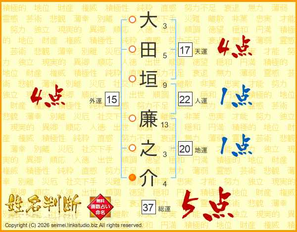 大(3画)田(5画)垣(9画) 廉(13画)之(3画)介(4画)