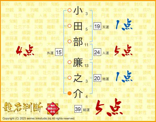 小(3画)田(5画)部(11画) 廉(13画)之(3画)介(4画)