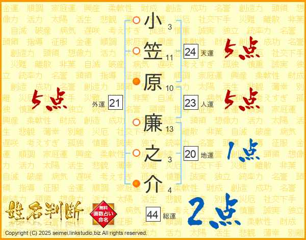 小(3画)笠(11画)原(10画) 廉(13画)之(3画)介(4画)