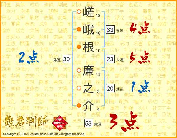 嵯峨根廉之介さんの人運は23画の5点!