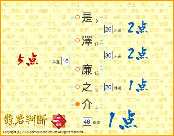 是(9画)澤(17画) 廉(13画)之(3画)介(4画)