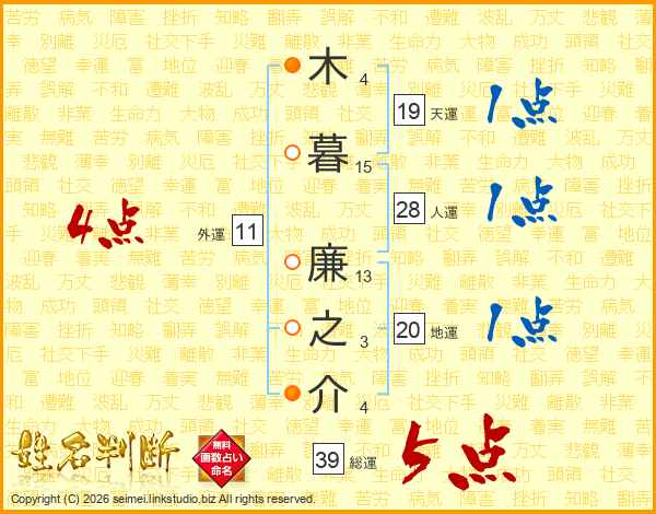 木(4画)暮(15画) 廉(13画)之(3画)介(4画)