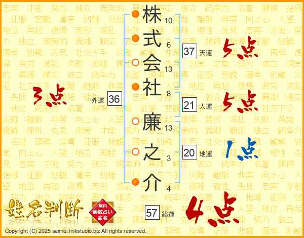 株(10画)式(6画)会(13画)社(8画) 廉(13画)之(3画)介(4画)