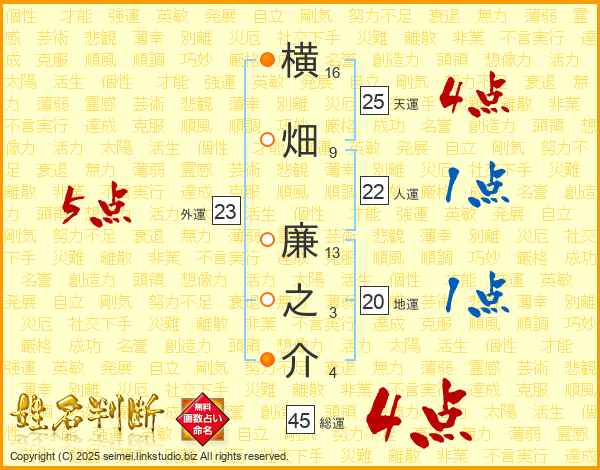 横(16画)畑(9画) 廉(13画)之(3画)介(4画)
