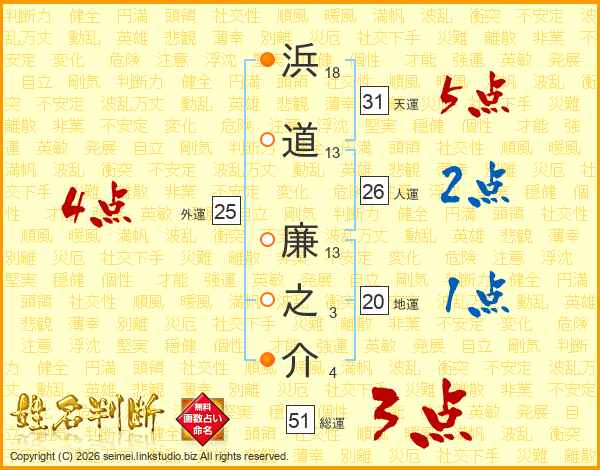 浜(18画)道(13画) 廉(13画)之(3画)介(4画)