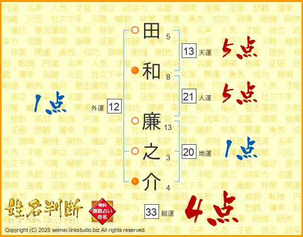 田(5画)和(8画) 廉(13画)之(3画)介(4画)