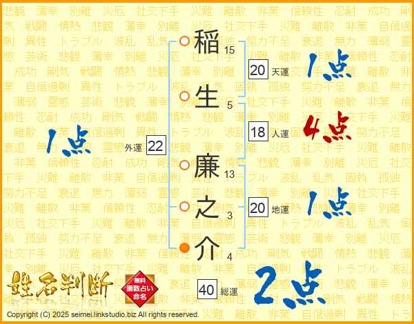 稲(15画)生(5画) 廉(13画)之(3画)介(4画)