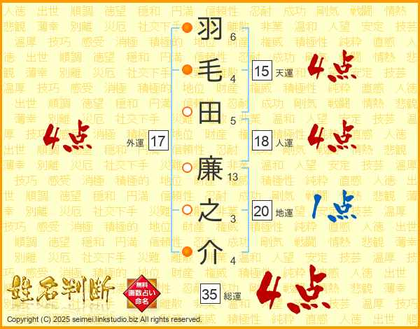 羽(6画)毛(4画)田(5画) 廉(13画)之(3画)介(4画)