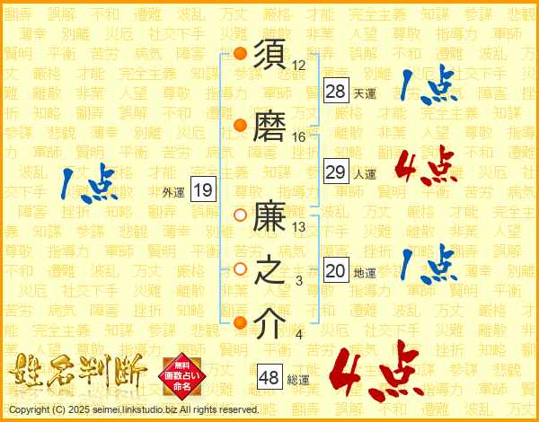 須(12画)磨(16画) 廉(13画)之(3画)介(4画)