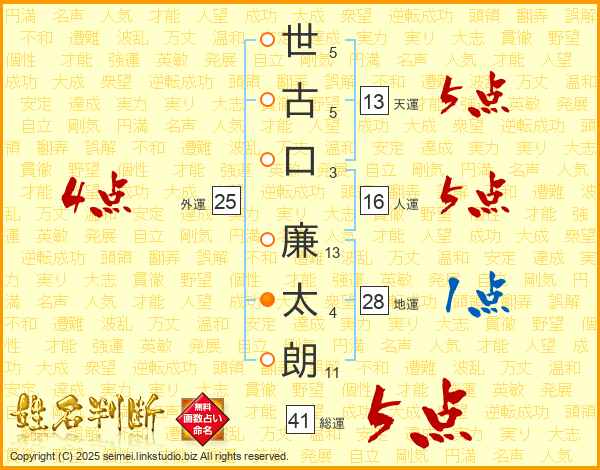 世(5画)古(5画)口(3画) 廉(13画)太(4画)朗(11画)