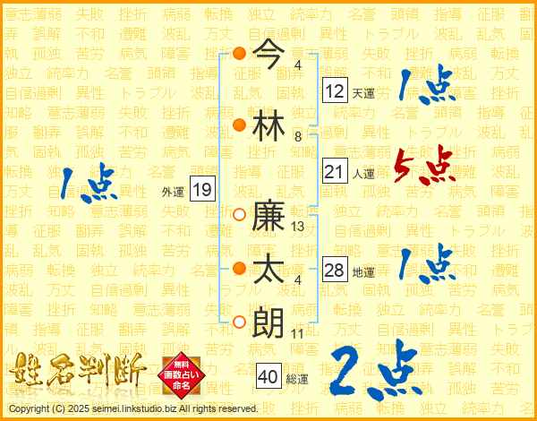 今(4画)林(8画) 廉(13画)太(4画)朗(11画)