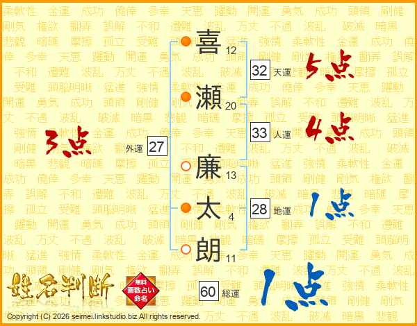 喜(12画)瀬(20画) 廉(13画)太(4画)朗(11画)