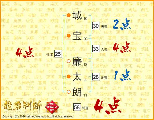 城(10画)宝(20画) 廉(13画)太(4画)朗(11画)