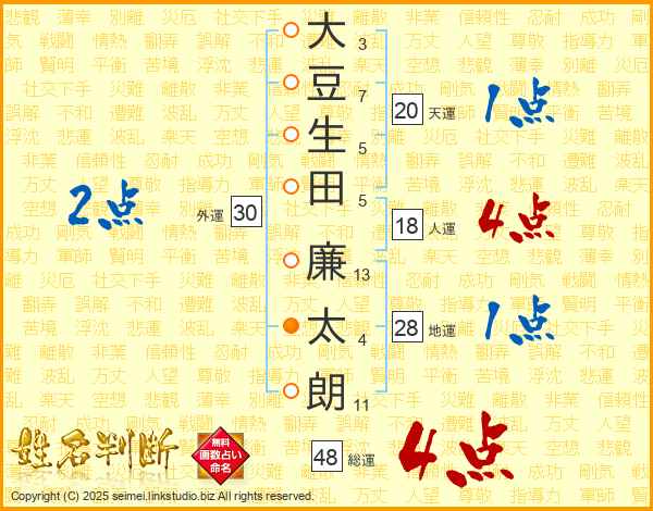 大豆生田廉太朗さんの総運は48画の4点!