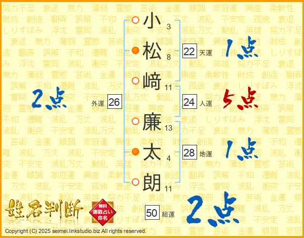 小(3画)松(8画)﨑(11画) 廉(13画)太(4画)朗(11画)