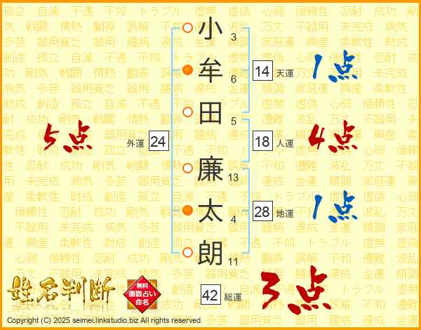 小(3画)牟(6画)田(5画) 廉(13画)太(4画)朗(11画)