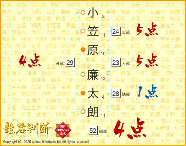 小(3画)笠(11画)原(10画) 廉(13画)太(4画)朗(11画)