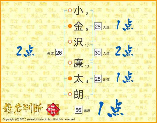 小(3画)金(8画)沢(17画) 廉(13画)太(4画)朗(11画)