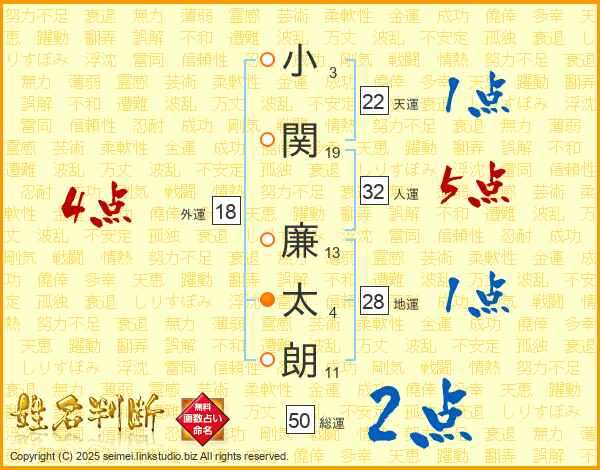 小(3画)関(19画) 廉(13画)太(4画)朗(11画)