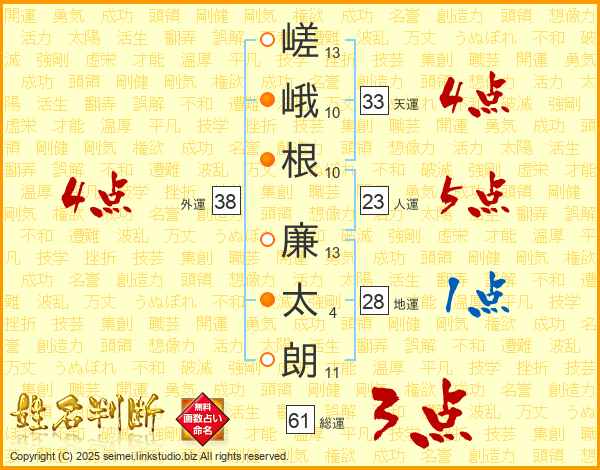 嵯(13画)峨(10画)根(10画) 廉(13画)太(4画)朗(11画)