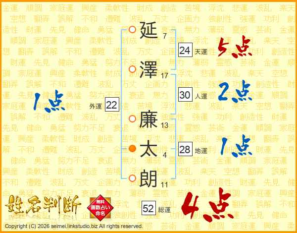 延(7画)澤(17画) 廉(13画)太(4画)朗(11画)