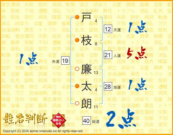 戸枝廉太朗さんの人運は21画の5点!