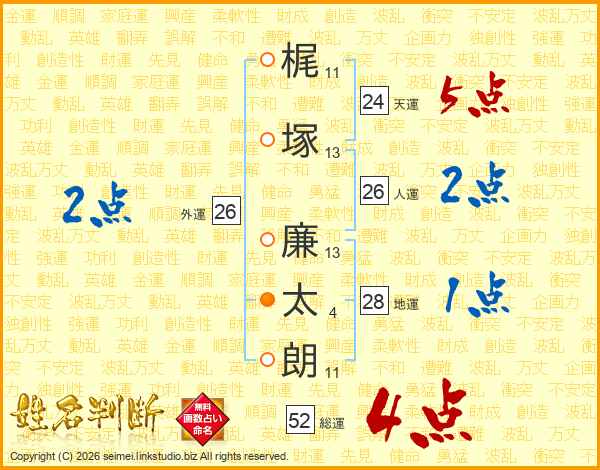 梶塚廉太朗さんの総運は52画の4点!