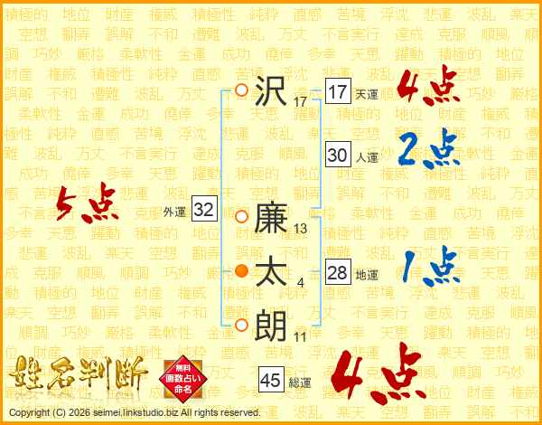 沢(17画) 廉(13画)太(4画)朗(11画)
