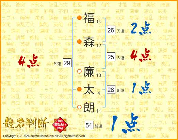 福(14画)森(12画) 廉(13画)太(4画)朗(11画)