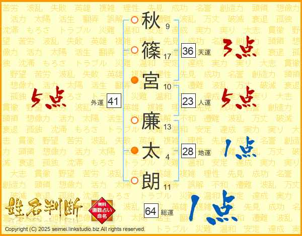 秋(9画)篠(17画)宮(10画) 廉(13画)太(4画)朗(11画)