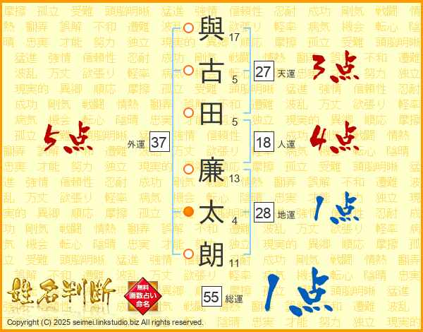 與(17画)古(5画)田(5画) 廉(13画)太(4画)朗(11画)