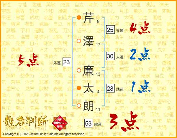 芹(8画)澤(17画) 廉(13画)太(4画)朗(11画)