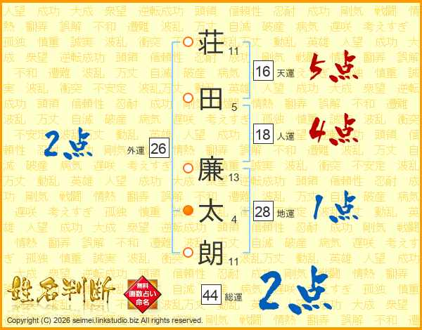 荘(11画)田(5画) 廉(13画)太(4画)朗(11画)