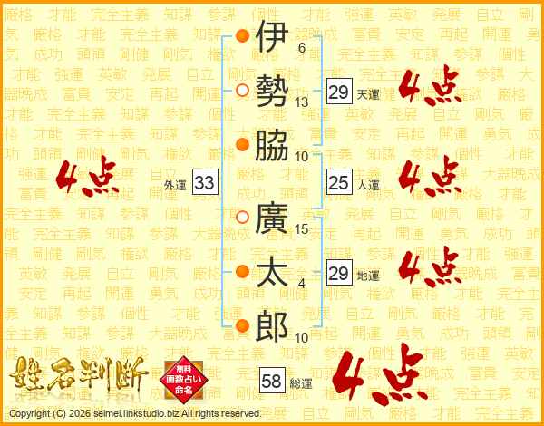 伊(6画)勢(13画)脇(10画) 廣(15画)太(4画)郎(10画)