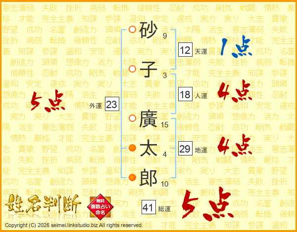 砂(9画)子(3画) 廣(15画)太(4画)郎(10画)