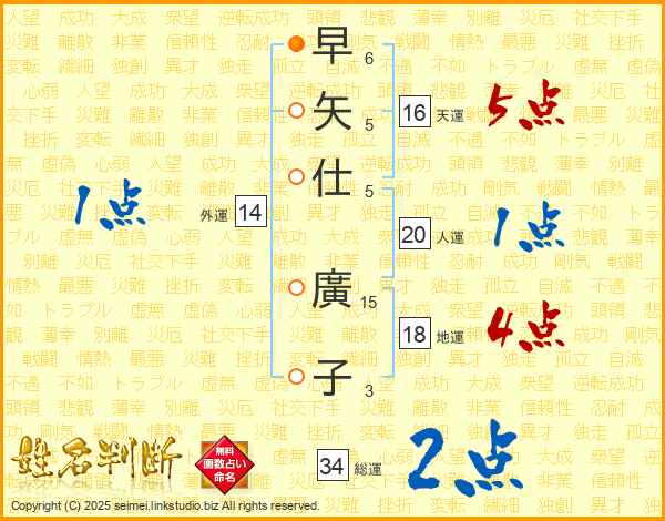 生活面を象徴する運勢です。外部から受ける影響力を表し、結婚運、家庭運や職場、環境への順応性を表します。総運から人運を引いた画数。姓や名が1文字の場合を除く。