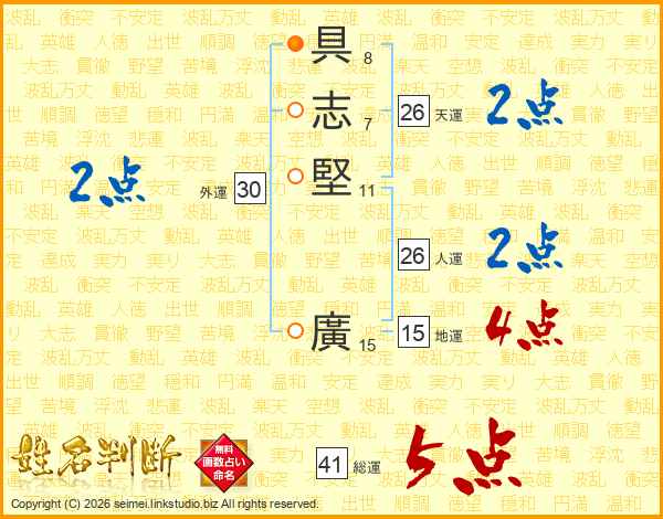 家系が持つ宿命的な運勢を表します。祖先から受け継いだ苗字ですので自分の力が及びません。家柄を象徴します。苗字の合計画数。