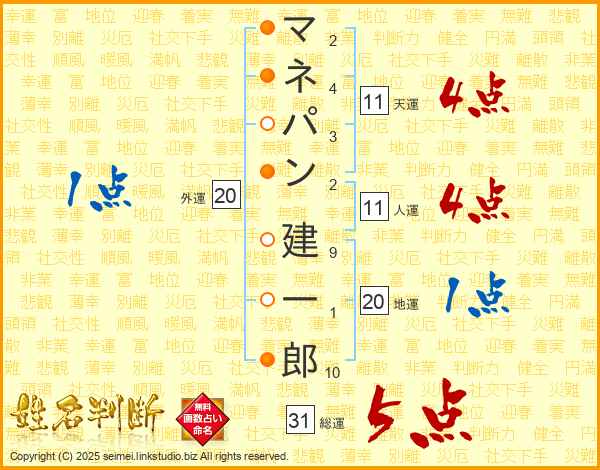 マ(2画)ネ(4画)パ(3画)ン(2画) 建(9画)一(1画)郎(10画)