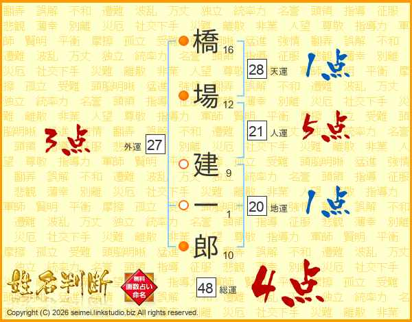 橋(16画)場(12画) 建(9画)一(1画)郎(10画)