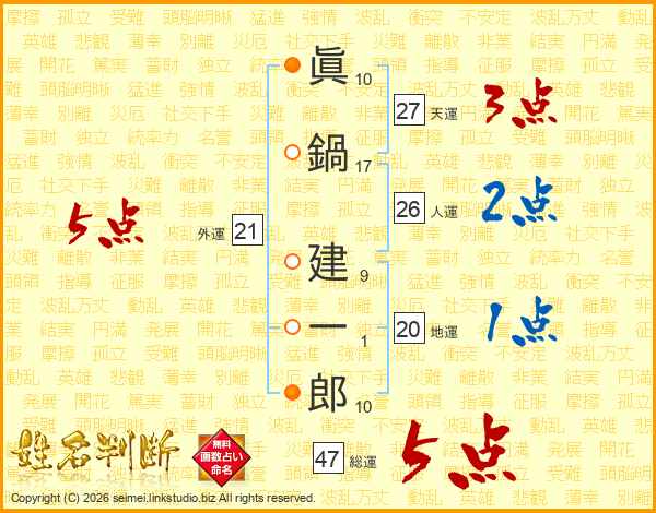 眞(10画)鍋(17画) 建(9画)一(1画)郎(10画)
