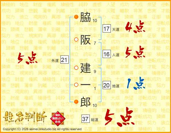 脇(10画)阪(7画) 建(9画)一(1画)郎(10画)