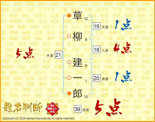 草(10画)柳(9画) 建(9画)一(1画)郎(10画)