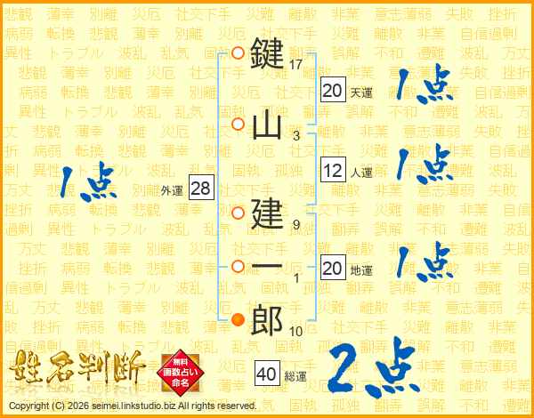 鍵(17画)山(3画) 建(9画)一(1画)郎(10画)
