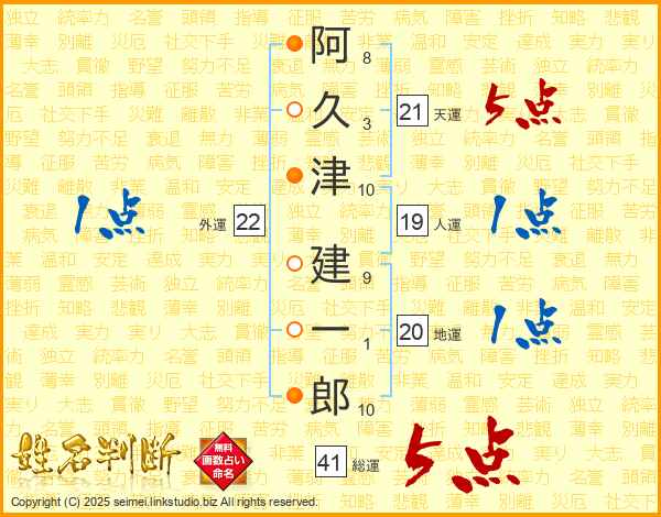 阿(8画)久(3画)津(10画) 建(9画)一(1画)郎(10画)