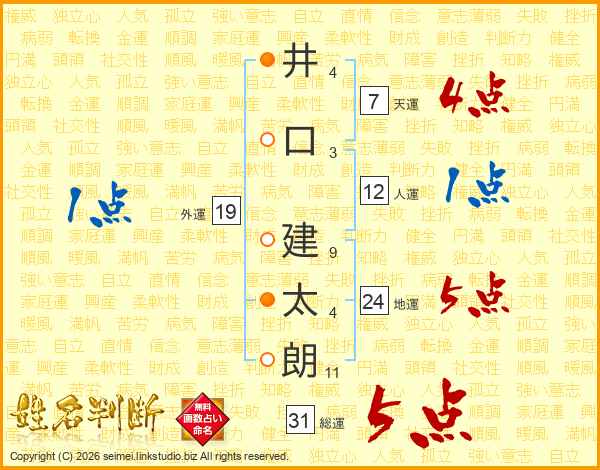 井(4画)口(3画) 建(9画)太(4画)朗(11画)