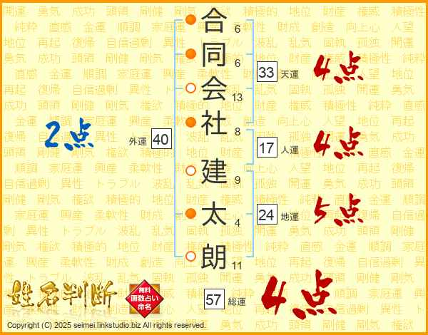 合(6画)同(6画)会(13画)社(8画) 建(9画)太(4画)朗(11画)