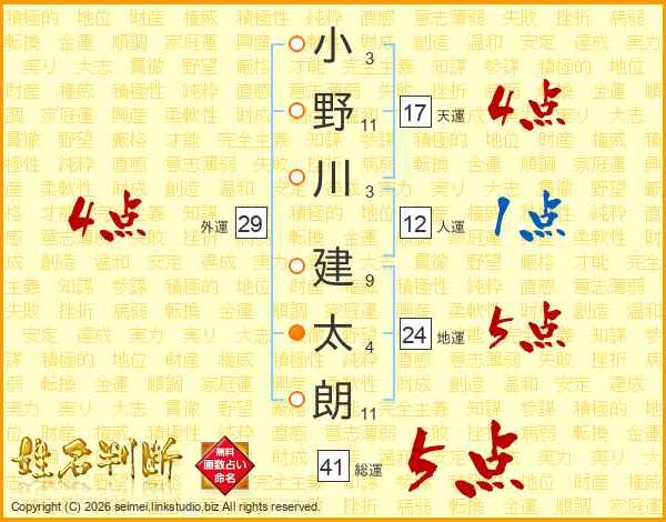 小(3画)野(11画)川(3画) 建(9画)太(4画)朗(11画)