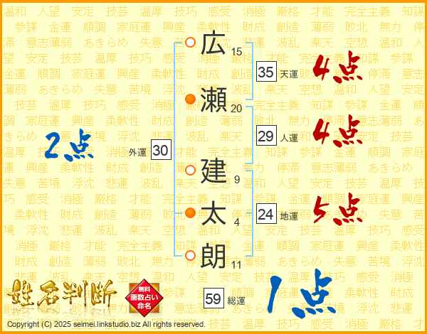 広(15画)瀬(20画) 建(9画)太(4画)朗(11画)